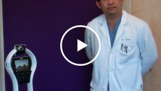 Bob Nguyen, MD, urologist at Boston Children's Hospital, shows off his department's teleurology robot, a cutting edge new device for a telemedicine pilot program at his practice.