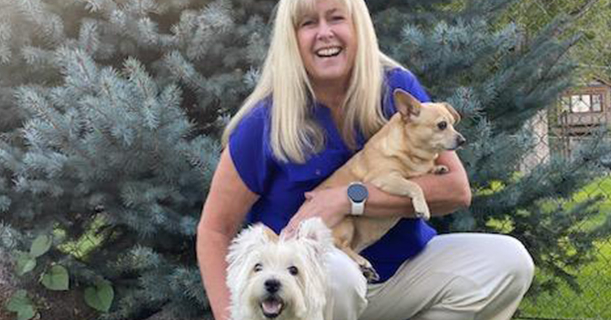 Buzzy (below) and Kiya (being held) with their best friend Sherri Lewis, director of revenue cycle management at the BoulderCentre for Orthopedics & Spine