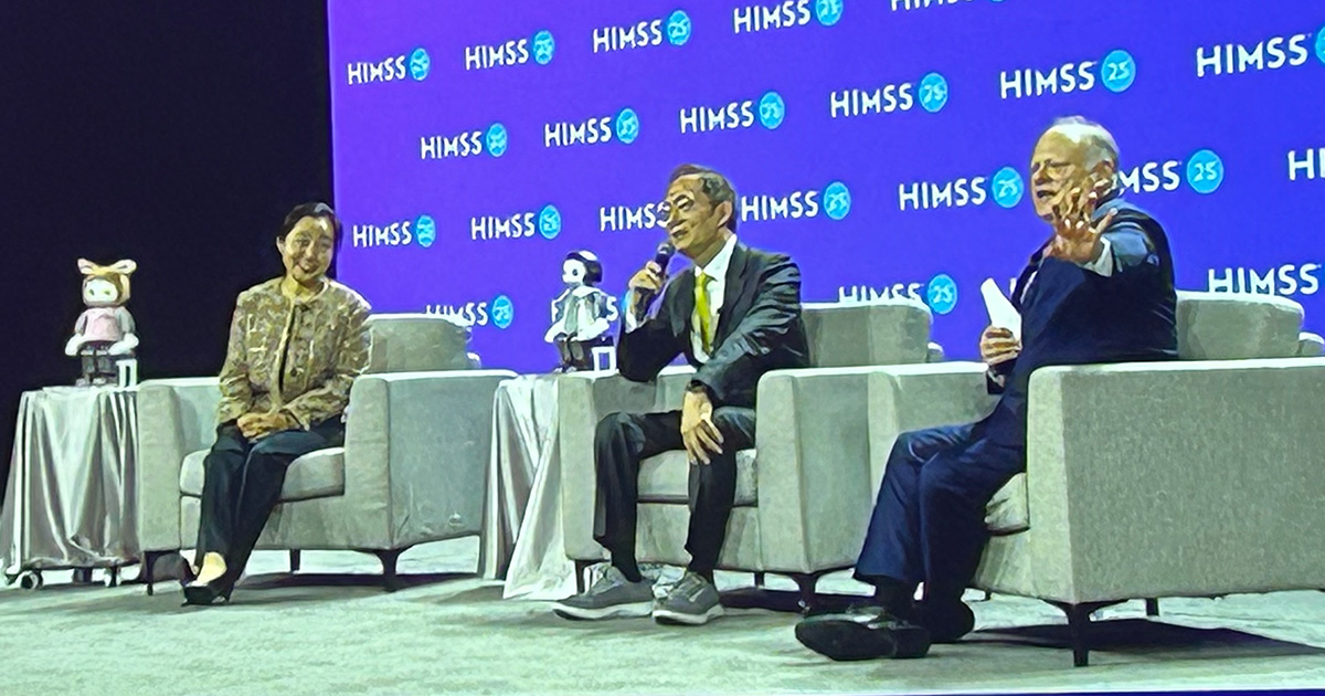 Meong Hi Son, CMIO, and Seung Woo Park, president, of Samsung Medical Center, and Hal Wolf, president and CEO of HIMSS, are joined by Nova and Lumi at HIMSS25 on Tuesday