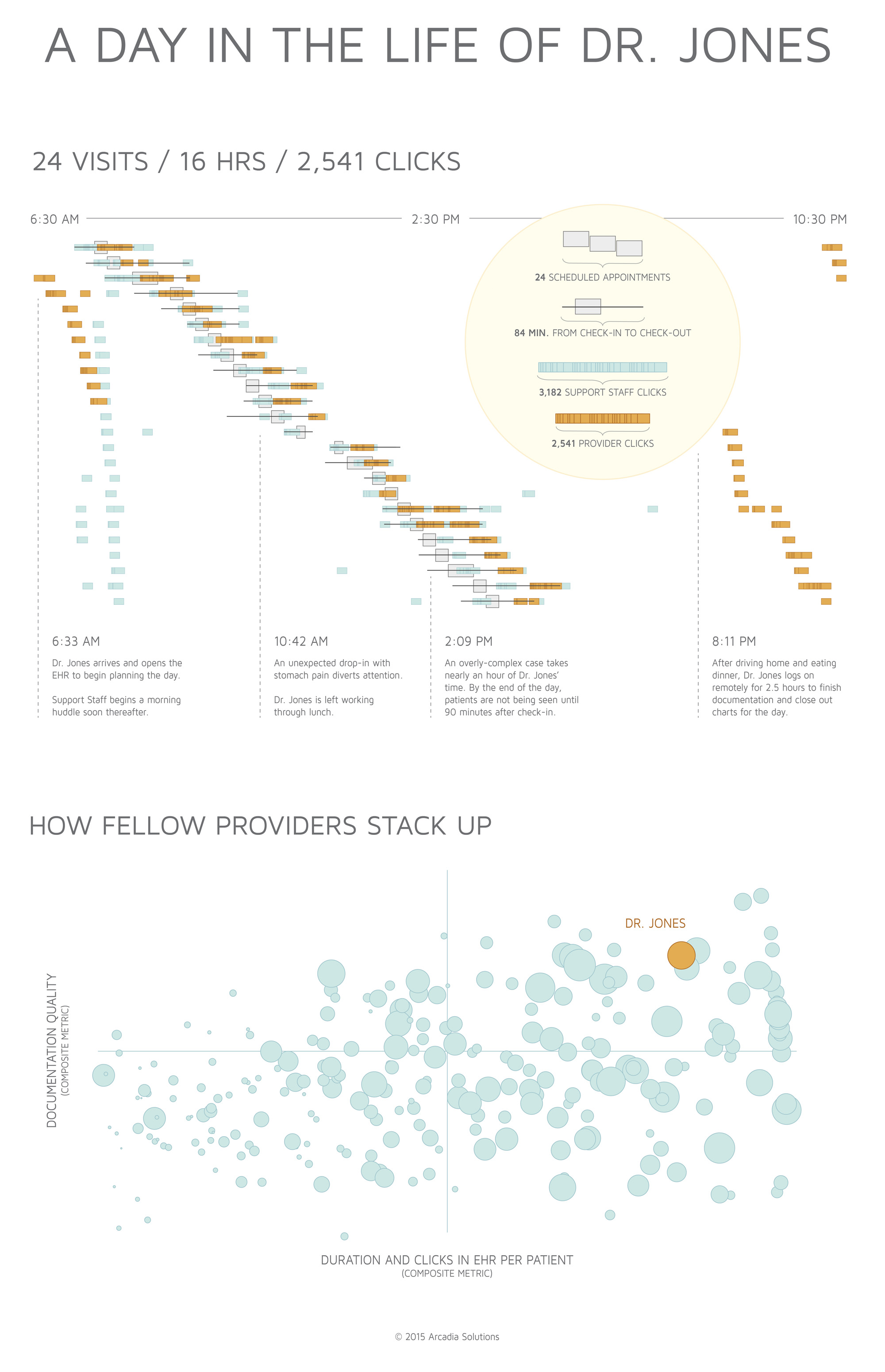 "In the first graph, a morning huddle with Dr. Jones and her team is shown by hundreds of actions in the charts of upcoming patients before the first visit begins. Throughout the day, the distance between the scheduled start time of a visit and the first 'click' by Dr. Jones paints a picture of increasing wait times, contributing to patient dissatisfaction," according to Arcadia.