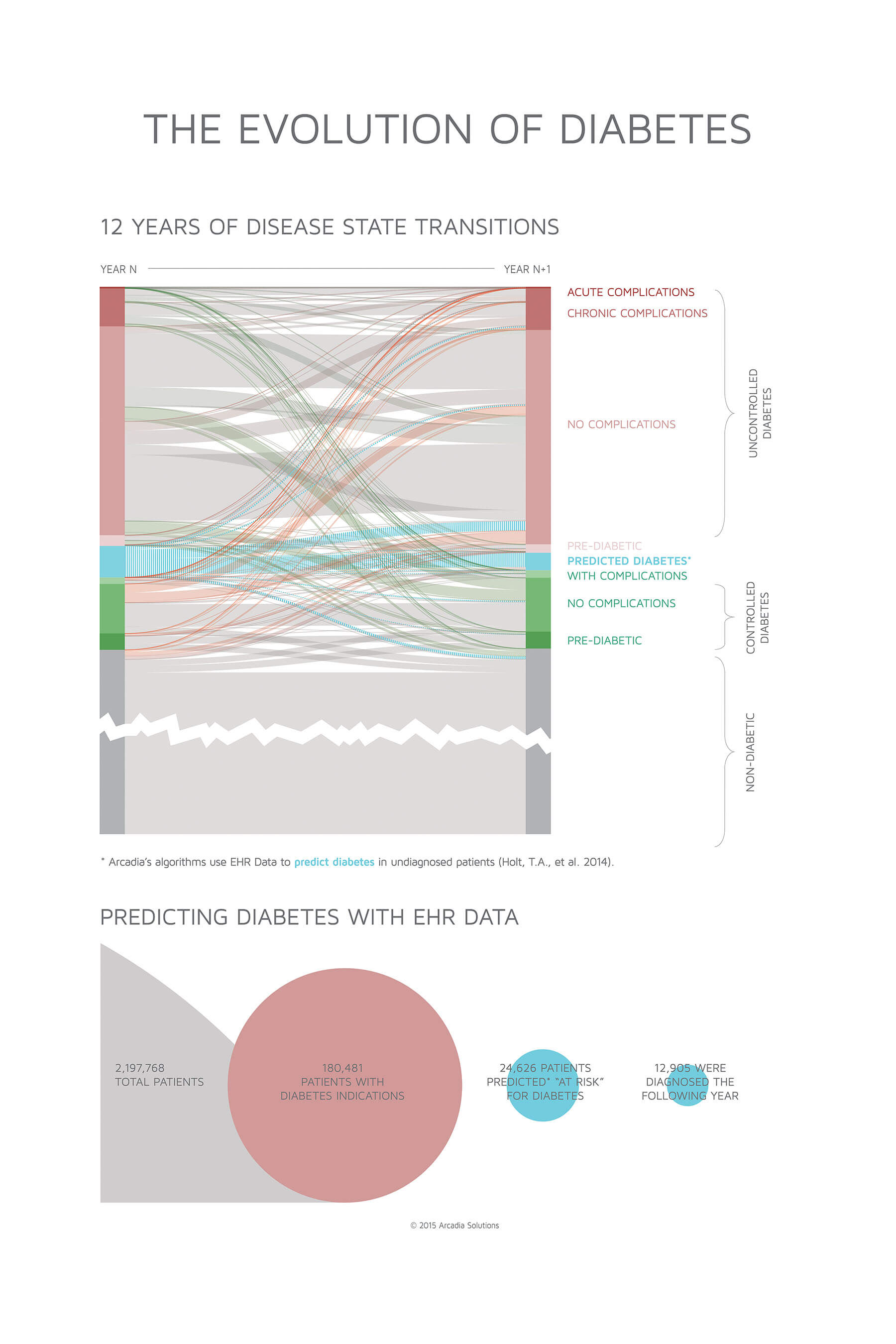 Based on de-identified claims and EHR data of more than 10 million people, this infographic from Arcadia Healthcare Solutions shows a decade-plus of diabetic patient data, normalized to show the movement of various states of severity and control of the condition.