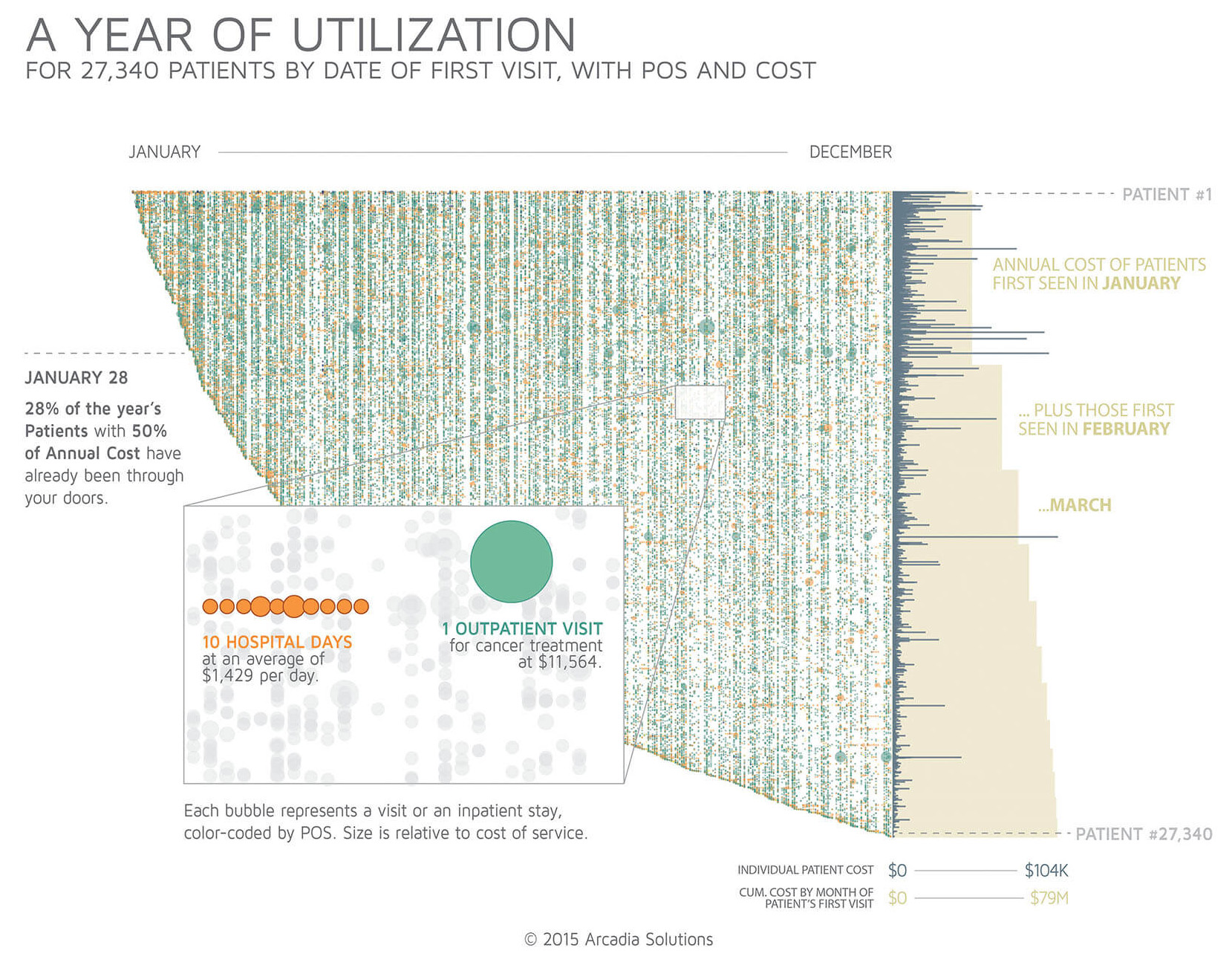 How's this for big data? This chart visualizes every visit for each of nearly 30,000 patients in an ACO, showing the quantity of data that accrues over the course of a year as the episodes of care add up.