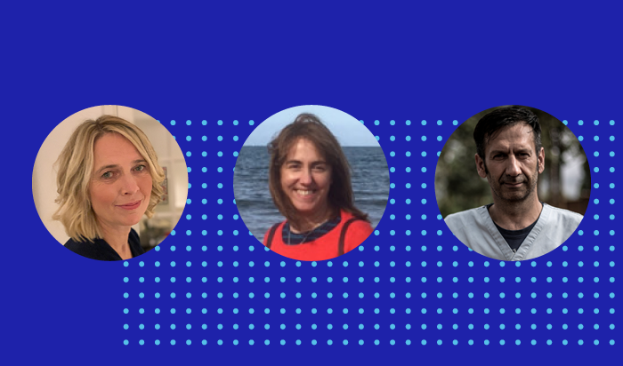 The webinar was chaired by Mette Maria Skjoeth from Odense University Hospital, Denmark (left), featured registered nurse experts Ann Gregory, clinical nurse advisor to NHSX in the UK (centre) and Luis Encinas, emergency coordinator, Médecins Sans Frontières, Spain (right).
